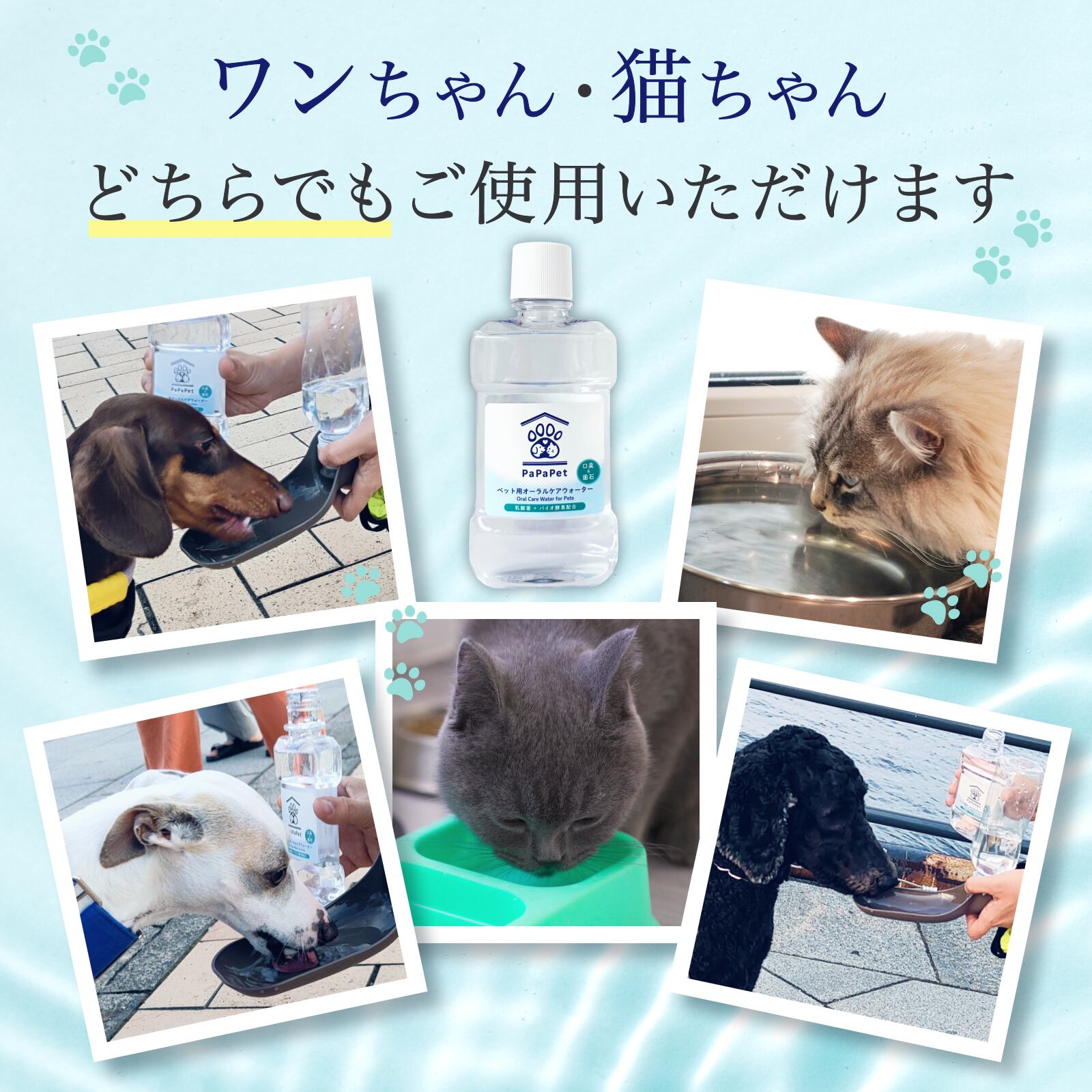 ペット用オーラルケアウォーターは、あなたの大切なペットの口腔環境を整えるために開発されました。このウォーターは、日々の飲み水に混ぜるだけで、口臭を軽減しながら、歯垢や歯石の形成を防ぐサポートをします。ペットが安心して飲める成分で作られており、毎日の健康管理にぴったりなアイテムです。ナチュラルな成分を使用しているため、どんなペットにも安心して使用できます。