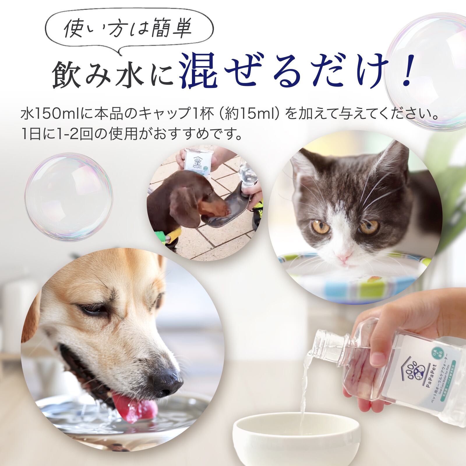 ・水150~200mlに本品のキャップ1杯(約15ml)を加え、ペットの体格や状態に合わせて、1日1~2回を目安にご使用ください。